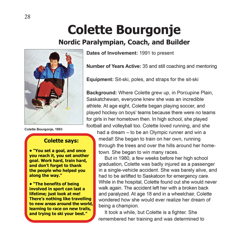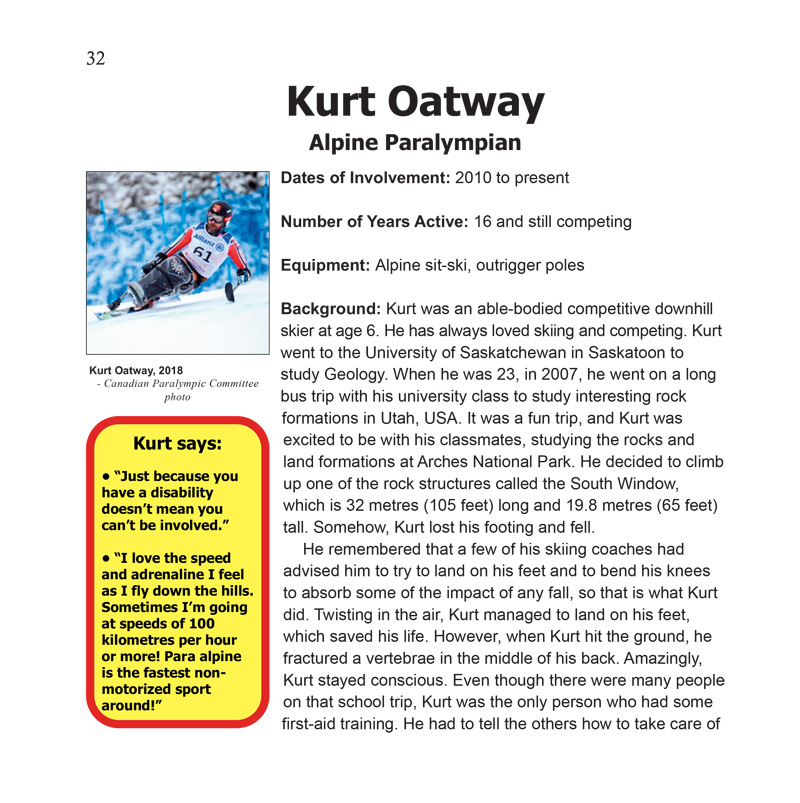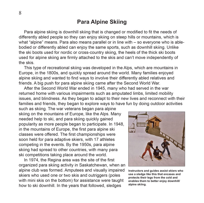 Did you know Saskatchewan has eight snow sports Paralympians? They have earned many Paralympic medals! They have competed in para adaptive snow sports such as alpine skiing, nordic skiing, biathlon, and snowboarding in Canada and around the world. Meet these incredible and accomplished athletes! Find out how their journeys began. Learn what challenges they faced as they trained and succeeded in these challenging sports. Meet and learn how coaches, trainers, guides, equipment personnel, planners, and others worked with and helped these fantastic athletes compete to the best of their abilities!