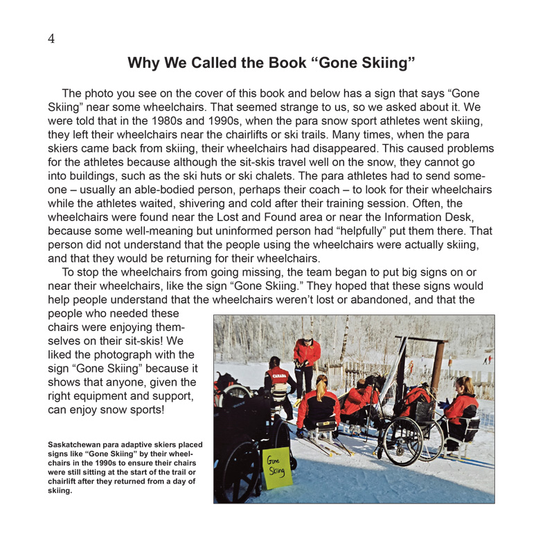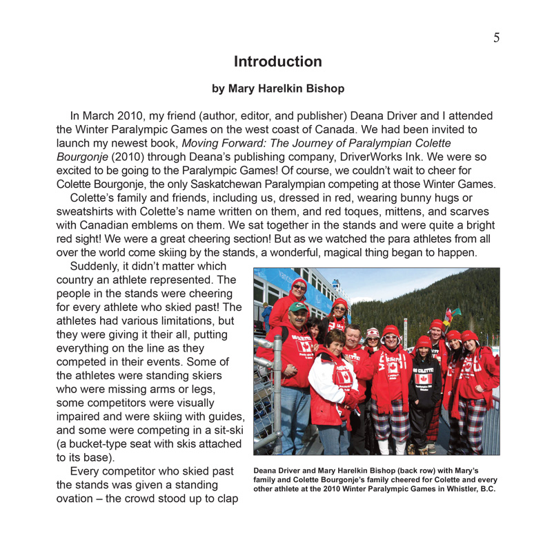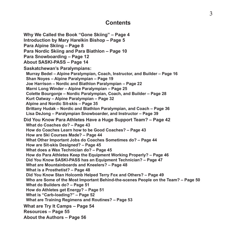 Mary Harelkin Bishop and Deana J. Driver are award-winning, bestselling Canadian authors. They have been collaborating on publishing books since 2008, when Deana edited and they co-published Mary’s kids’ fiction book Seeds of Hope. Their first written connection to the SASKI-PASS community was as the author (Mary Harelkin Bishop) and editor-publisher (Deana J. Driver) of Moving Forward: The Journey of Paralympian Colette Bourgonje, which was launched with Colette Bourgonje at the Saskatchewan Pavilion of the 2010 Paralympic Games in Whistler, B.C. This two-book project of Prairie Peaks and Tracks and Gone Skiing marks their first collaboration as co-authors. The authors are honoured to have worked on these books for Saskatchewan Ski Association Para Adaptive Snow Sports (SASKI-PASS) and the Saskatchewan Sports Hall of Fame.